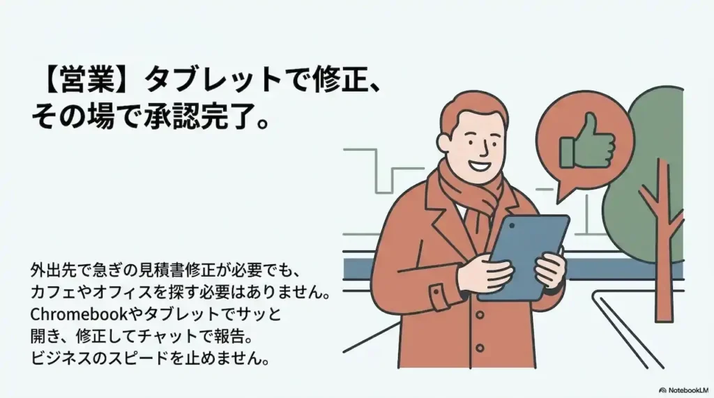 例えば営業担当の方。外出先でお客様から急ぎの確認依頼が入ったとします。送られてきたのはパスワード付きの見積書データです。これまでは会社に戻るか、PCを開けるカフェを探す必要がありました。しかしこれからは、持っているタブレットやChromebookでサッとファイルを開き、その場で数字を修正して、上司にチャットでリンクを送って承認をもらう、といったスピード対応が可能になります。