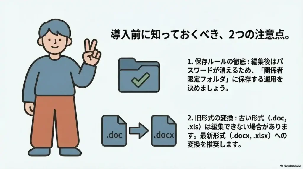 2つ目は、古いファイル形式への対応です。今回の機能は、現在の標準的な形式(.docx,.xlsx,.pptx)に対応しています。10年以上前の古い形式(.doc,.xls)のファイルは、そのままではうまく編集できない場合があります。これを機に、古いファイルは新しい形式に変換して保存し直すことをおすすめします。