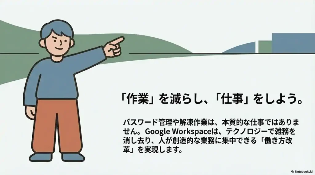 2026年のGoogle Workspaceのアップデートは、単なる機能追加ではありません。私たちを面倒な「パスワード管理」や「ファイルの解凍作業」から解放し、より本質的な仕事に集中させてくれるための「働き方改革」ツールです。