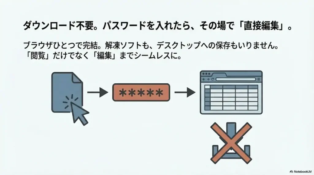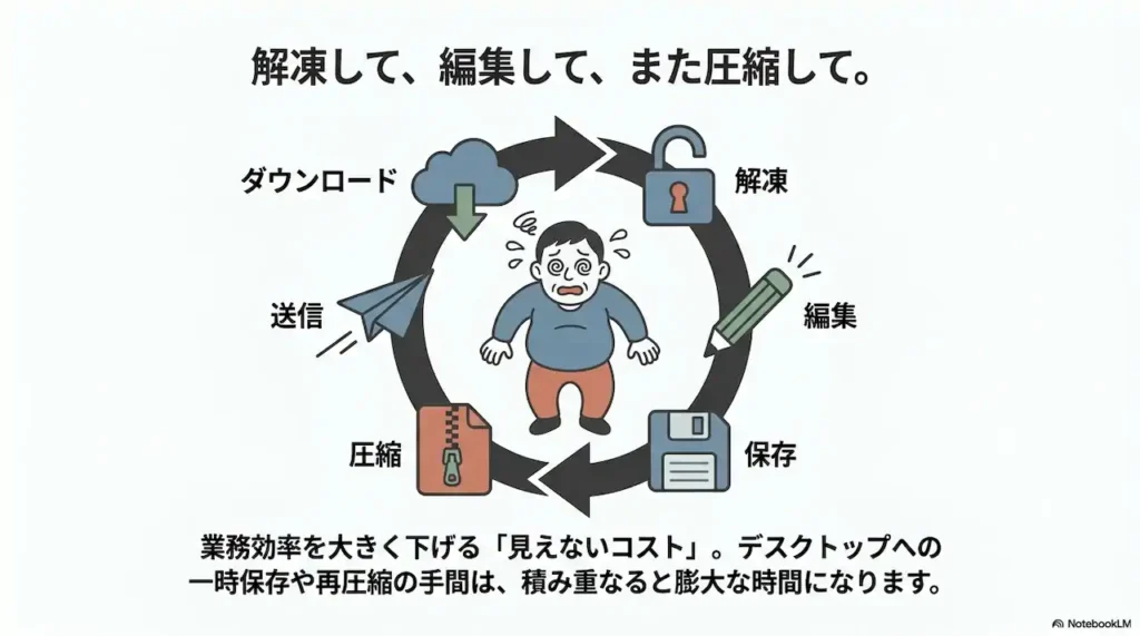 出先でスマホから確認しようとして開けず、結局会社に戻ってPCを開く羽目になった、という経験はありませんか。あるいは、ファイルを修正して返信するために、一度デスクトップに保存して、編集して、またパスワード付きZIPファイルを作って…という作業にうんざりしていませんか。