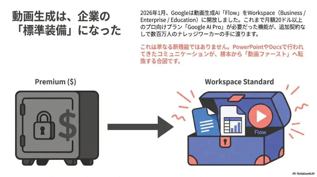 ついにGoogleが動いた。これまで一部のプロフェッショナルや高額プラン契約者だけの特権だったAI動画生成ツール「Flow」が、Google Workspaceの一般ビジネスプランに開放されました。これは単なる「新機能の追加」ではない。PowerPointやDocsで行われてきた企業コミュニケーションが、根本から「動画ファースト」へと転換する号砲かもしれない。