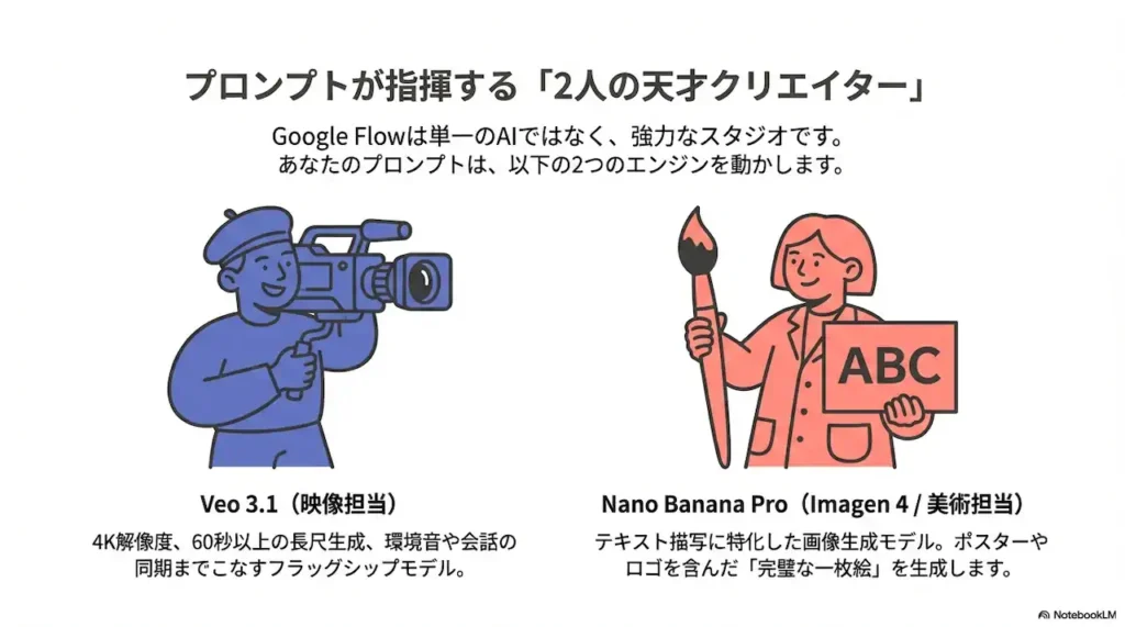 Flowは単一のAIではなく、複数の強力なモデルが連携するスタジオです。