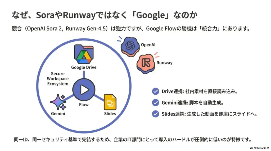 Driveにある素材を読み込み、Geminiで脚本を書き、Flowで動画化し、それをSlidesに貼り付ける。この一連のフローが同一ID、同一セキュリティ基準の中で完結する点は、企業のIT部門にとって最大の採用理由になり得ます。特に、Nano Banana Proによる正確なテキストレンダリング(画像内の文字生成)は、ブランドロゴや製品名を扱う企業利用において、競合に対する大きなアドバンテージです。
