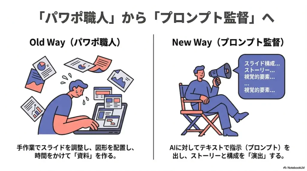 これまでは「撮影・編集スキル」がボトルネックでしたが、これからは「どう指示するか(プロンプト)」と「何を伝えるか(ストーリーテリング)」が価値の源泉になります。
