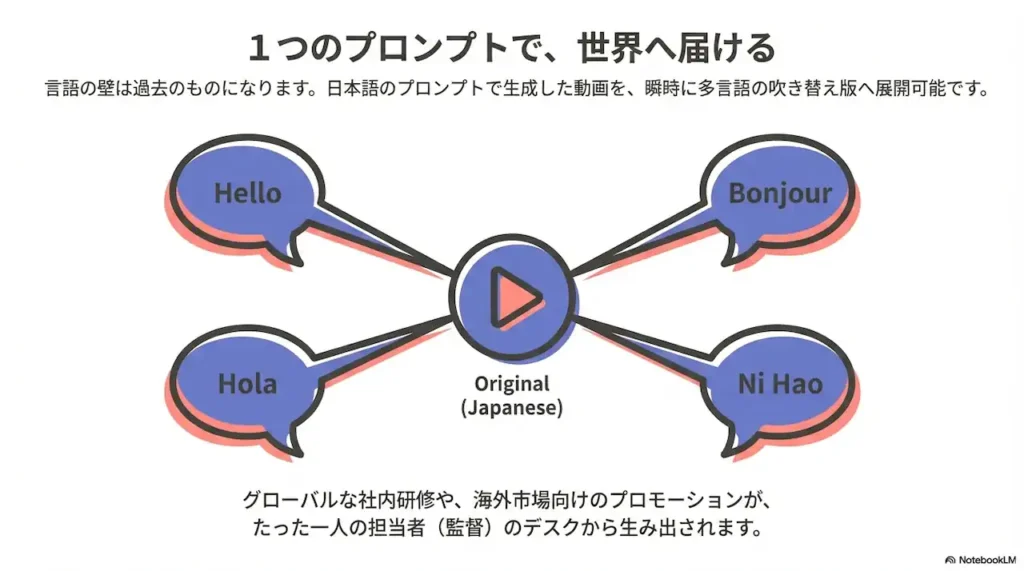 - グローバル展開: 一つの動画から、多言語の吹き替え版を瞬時に作成。