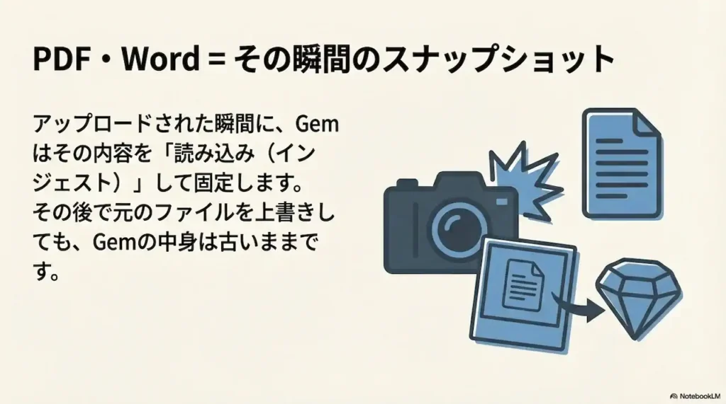 これらのファイルは、アップロードされた瞬間にGemの中に「読み込み(インジェスト)」されます。つまり、その時点でのスナップショットが保存されるのです。たとえGoogleドライブ上で元のPDFを上書き保存したとしても、Gemが保持しているのは古いバージョンのままです。