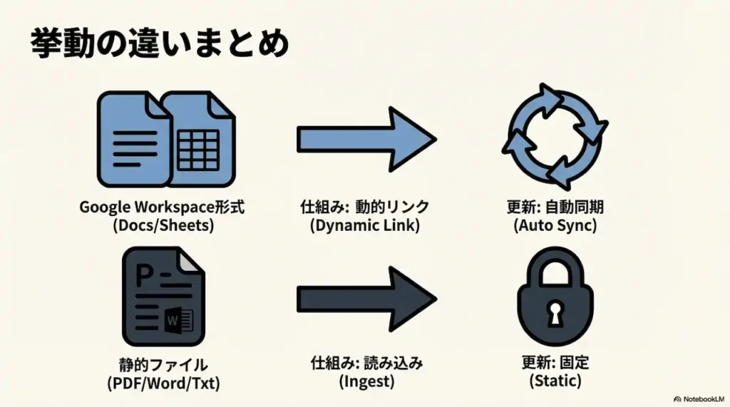 「Googleドキュメントを更新するだけで、Gemは自動的に新しいルールを知る」という挙動は、Gemsを使いこなす上で最も重要な鍵となります。一方で、すべてのファイルがそのように動作するわけではありません。