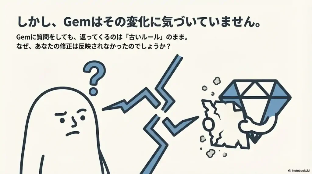 自分専用のAIアシスタント「Gemini Gems(ジェム)」を作成し、業務マニュアルやプロジェクト資料を学習させている方は多いでしょう。しかし、元のファイルを修正したとき、Gemはその変化に気づいているでしょうか?